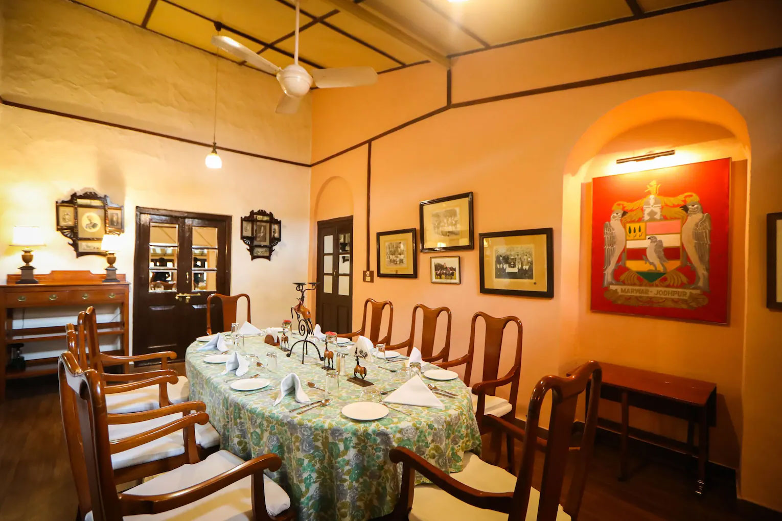 Dining: Features multiple dining options, including a dining hall and outdoor,, garden seating serving authentic Rajasthani, Indian, and continental cuisine.